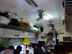 me jeli vlakem typu hard seats, které vypadají jako kříženci vozů třetí třídy ČSD za První republiky a vagónů na přepravu prasat. Dřevěné sedačky, málo místa, zamřížovaná okna. Jediná dobrá věc byla, že u stropu běžely ventilátory, takže se tam dalo vydržet.